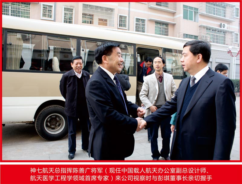 神七航天總指揮陳善廣將軍來公司視察時與彭琪董事長親切握手